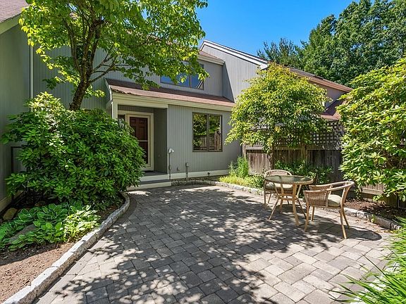 Welcome to the Hills at Mainstone! This 'E' style townhome welcomes you the minute you open the front gate. The stunning cobblestone courtyard entrance opens to the bright kitchen with stainless steel appliances, dining/living room and first floor den that offers flexibility for an office or a guest room. The first floor features hardwood floors, fireplace, full bathroom and sliders to private deck overlooking the wildflower fields. The second floor primary bedroom has an updated en suite bath and walk in closet. The finished walk-out lower level includes home offices, family room, cedar closet, laundry, storage space and full bathroom. The Hills community, surrounded by conservation land and trails, offers many amenities including a clubhouse, 2 tennis courts and swimming pool. Enjoy all that the Hills has to offer in a convenient commuter location.