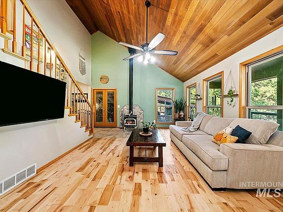 Discover the perfect blend of comfort and sustainability in this beautifully updated home, designed to zero out your monthly energy costs with a full solar array. This property offers a private office, ideal for remote work, and an upstairs loft perfect for company or extra storage. Remodeled master and upstairs bathrooms as well as newer Energy Star windows installed in 2022 and new water heater ensuring efficiency and style. The hardwood floors have been refinished, and relatively new paint throughout gives the home a modern feel. Enjoy outdoor living on the spacious deck, perfect for entertaining or soaking in the serene surroundings. The fenced yard is ideal for pets and provides ample space for recreation, while a horseshoe pit adds to the outdoor fun. Heated two-car garage, carport, and useable space for RV parking is super functional for the car, toy and recreational enthusiast. Experience mountain life with a quiet atmosphere, abundant wildlife, and close to Boise.