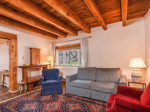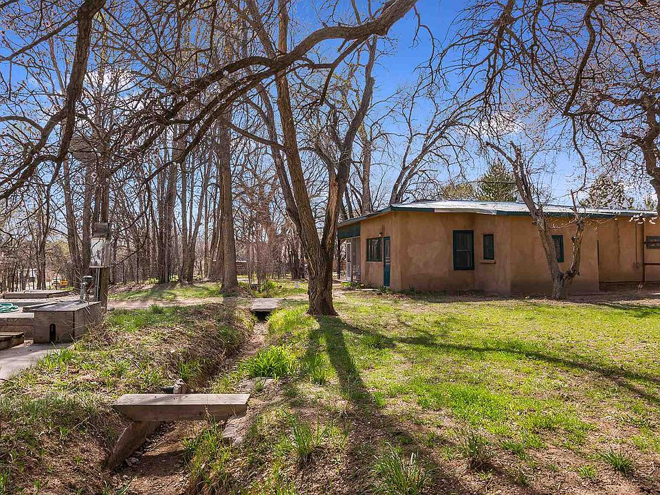 Classic New Mexico Adobe Farmhouse with Acequia. Located in the heart of Nambe on .82 irrigated acres, this home evokes a simpler time in northern New Mexico. Set in a historic farming valley, there are some views out to the Sangre de Cristo mountains and nearby hoodoos from within the mature Apricot and Cottonwood stands that adorn the property. Originally built in 1938, the home has been modernized with new heating and septic systems within the last 10 years while retaining it's basic 3 bedroom, 1 bathroom floor plan. The kitchen and dining area flow openly toward the living room with adobe trombe wall, heavy beams, and woodstove helping to define the two spaces. Two of the bedrooms, including the master, have their own south-facing doors, and are steps away from the working acequia that brings life-giving water to the nearby properties. The home is move-in ready as it is or with a little imagination, has the potential to brought to a whole new level. Custom pet patios may keep your animals safe or be removed prior to closing. Property is adjacent to established pueblo-owned vineyard. Don't miss this opportunity.