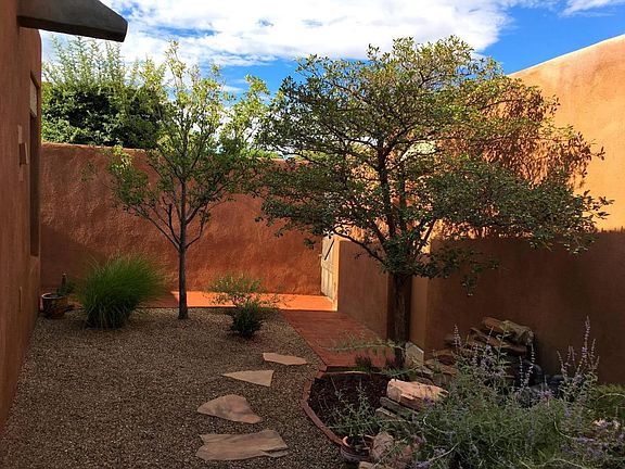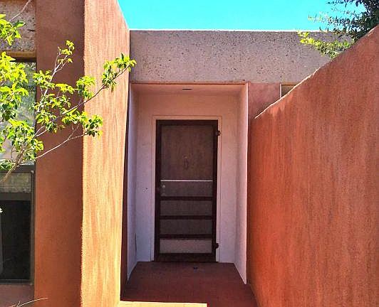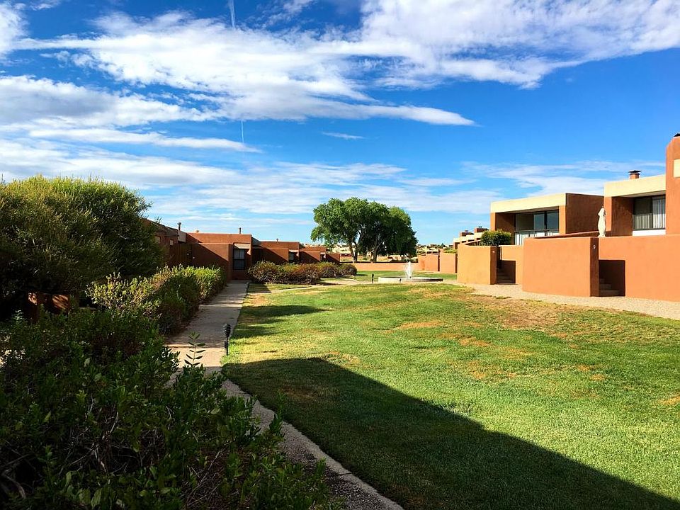Welcome to Architect Antoine Predock's historic Westside La Luz community-on-the-Bosque. Enjoy stunning City/Bosque/Mtn views from Kitchen, Dining, Living Rooms & Master Bedroom, while surrounded by 5 acres of gardens & greenspaces among 40 acres Forever Open Space. Designed for in/outdoor living w/private entry courtyard from 2-car garage, & fabulous east courtyard w/the views & greenspace access--great La Luz location! Inside: open Chef's kitchen w/tons o' counters, large b'fast bar, glass china cabinets & pantry. Spacious home includes brick flooring, updated electric panel, custom fireplace, built-in shelves, unique banco, vaulted livingroom ceiling, recessed, skylights & mostly thermal windows! Private Master w/2 closets & those city views! Newer furnace & H2O heater. Wow-come see!