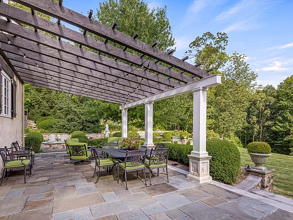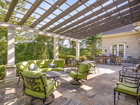 Situated on over three acres in the picturesque Mountainville section of Tewksbury, a custom French Country home is a distinctive presence in the Hunterdon Hills. Set far back from the road and accessed by a circular drive lined in boxwoods, the graceful stone and stucco architecture is capped by a wood shingle roof. Inside, a flowing 17-room floor plan offering six bedrooms, seven full baths and a powder room measures approximately 6,649 square feet, with approximately 2,189 square feet of additional finished living space in the walkout lower level. There is a three-car garage adjoining a roomy parking court. The peaceful surroundings include a resort-style heated gunite pool and spa, a stone-walled terrace with built-in grill and bar seating, a pergola shading a bluestone patio, entertainment-friendly fire pit area, plus covered and open porches, all overlooking formal landscapes and green lawns. This residence's prime cul de sac location affords an extra measure of privacy in Shallow Brook Estates, one of the region's most notable luxury home enclaves. Highlights of the sun-filled layout included random-width oak hardwood floors, detailed millwork, five masonry fireplaces, floor-to-ceiling windows framing pastoral views, French doors, high ceilings, custom lighting, plantation shutters, a wet bar and generously-sized rooms. Introducing the home is a customized double door revealing the two-story foyer, where a curving staircase is edged in ornate custom-made iron railings. Leading from the foyer is a formal dining room fitted with a huge picture window and dimensional moldings. In the step-down living room, a fireplace, coffered ceiling and sets of French doors to the terrace or library are featured. The library has handsome built-in bookcases, classic crown moldings and wainscoting. Wonderfully updated, the chef's kitchen contains commercial-grade stainless steel appliances from Viking, Miele and Sub-Zero, a center island with breakfast bar seating, marble countertops, custom dark wood cabinetry and a built-in espresso station. Connected to the kitchen is a butler's pantry offering marble counters, a bar sink, Viking ice maker and Viking wine cooler. The breakfast room's focal point is a stone wall gas fireplace, while French doors to the patio, a rear staircase and window wall are further amenities. Continuing the open flow is a spectacular two-story great room featuring beamed cathedral ceilings, a raised-hearth floor-to-ceiling fieldstone fireplace, arched windows and French doors to the patio or covered rear porch. Natural light streams into the beamed ceiling atrium from two window walls and French doors accessing the outside. A thoughtful first-floor guest bedroom suite with a private full bath, plus laundry and powder rooms, complete this level. Upstairs, the primary suite of rooms begins in an expansive bedroom warmed by the glow of a masonry fireplace and featuring a walk-in closet and elegant crown moldings. The primary sitting room or office is spacious and has plantation shutters. In the spa-inspired primary bath, marble floors, a marble shower enclosed by clear glass doors, a jetted platform tub and dual sink vanities are gracious touches. Four additional en suite bedrooms, one with a private sitting room, each adjoin a designer full bath. Finishing this level is a welcome gathering room that's ideal for movie or game nights, plus a second laundry room. The full, finished walkout lower level is arranged with a fireside recreation room, inviting built-in bar room, billiards room, media room, windowed exercise room, sauna, full bath and storage room. Serving this home are multiple zones of forced hot air propane heat, central air conditioning, a built-in 21K generator, a six-bedroom septic installed in 2019, central vacuum, security system, stereo system, outdoor sprinkler system, private septic, well water and underground utilities. Tewksbury Township is celebrated for its rolling landscapes, charming small villages and relaxed lifestyle. The township is close to Interstate 78 for commuters and offers incredible recreational opportunities for hiking, horseback riding, cycling and fishing in local parkland and nature preserves.