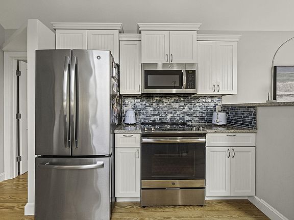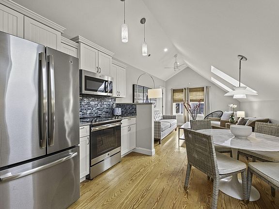 Smartly renovated and beautifully decorated top floor two-bedroom condo in an ideal near West End location. An outside stairway with a comfortable rise and run brings you up to a private deck and the main entrance. The sunlit great room features remote control skylights with electric shades, a well-designed kitchen, and a comfortable dining and living area. Both bedrooms accommodate queen-size beds. Small format subway tiles in white and vintage green set a relaxing tone in the spacious bathroom with built in storage and and stack laundry in the closet. The exterior of the building is equally well maintained with newer siding, decks, railings and lighting. Split system AC and heat, baseboard electric, pet-friendly, and rentals allowed. Includes one outside parking space and the right of first refusal to purchase garage Unit #4 for $249,000 (MLS#22405883)