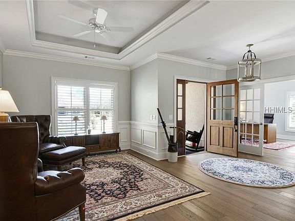 Have the best of both worlds in this exclusive 55+ Sun City HH waterfront. This is a custom home in Riverbend with 3 bedrooms, 2 full baths and 2 half baths. There is tile and hardwood downstairs and a carpeted second-floor bonus room, great room with 10 foot ceilings with fireplace, wet bar, Covered rear screen porch and large open deck overlooking lush landscape in Woodlands. Granite countertops, stainless appliances, kitchen has island and 5??? x 8??? pantry, spacious master suite, steel storm window panels, spacious two car garage plus golf cart with epoxy floor.