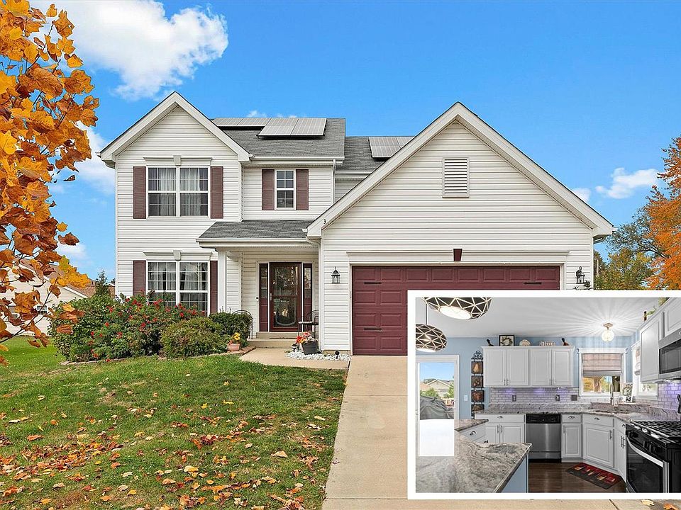 Beautiful 2 story home in desirable neighborhood close to shopping, dining & I-64 with 4 beds and 2.5 baths. With lovely landscaping and resplendent shade trees, this home is meticulously maintained inside and out. An inviting front porch beckons you to enter via the spacious foyer with rich laminate floors and formal living & dining rooms on either side. A large family room offers a fireplace and many windows with wonderful backyard views & custom shades. This space opens to the impressive eat-in kitchen featuring granite counters, stainless steel appliances, undermount corner sink & updated lighting. The large island offers breakfast bar seating and an adjacent eating area with slider to the deck. The 2 car garage includes an entry through the roomy laundry/mud room with built-in cabinets. Large master suite and spacious secondary bedrooms. Finished basement with rec room, game room, bar & fitness area. Fenced backyard with above ground pool and deck. Energy efficient solar panels!
