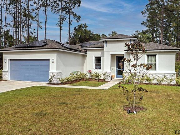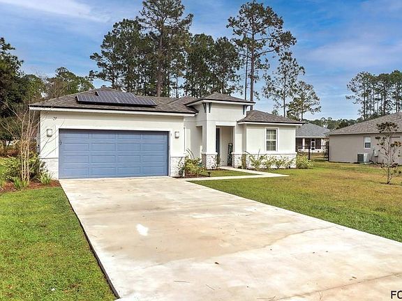 Absolutely stunning almost new construction property in the heart of Palm Coast. High-quality, high-performance, energy-efficient home has solar panels and tesla battery backups that keeps things running if the power happens to go off so that you can weather any storms in comfort.. House was built with luxury upgrades to include Energy Star SS Appliances, top of line AC 16-Seer AC, Smart Voice Control EcoBee Thermostat, luxury plank flooring, QUARTZ countertops in kitchen and baths, LED lighting throughout, 36" cabinets in kitchen, open floor plan to include 9' 4" ceilings with tray ceiling in Master Bedroom, large WALK-IN closet, Energy Efficient Water Heater, Low-E double pane energy-efficient windows, Polymaster Block-fill foam walls and spray foam insulated attic for ULTRA Energy Efficiency. Above ground pool with a deck. No need to wait for a new construction home to be built, this home is turnkey with all the new construction warranties transferable to the new owners.