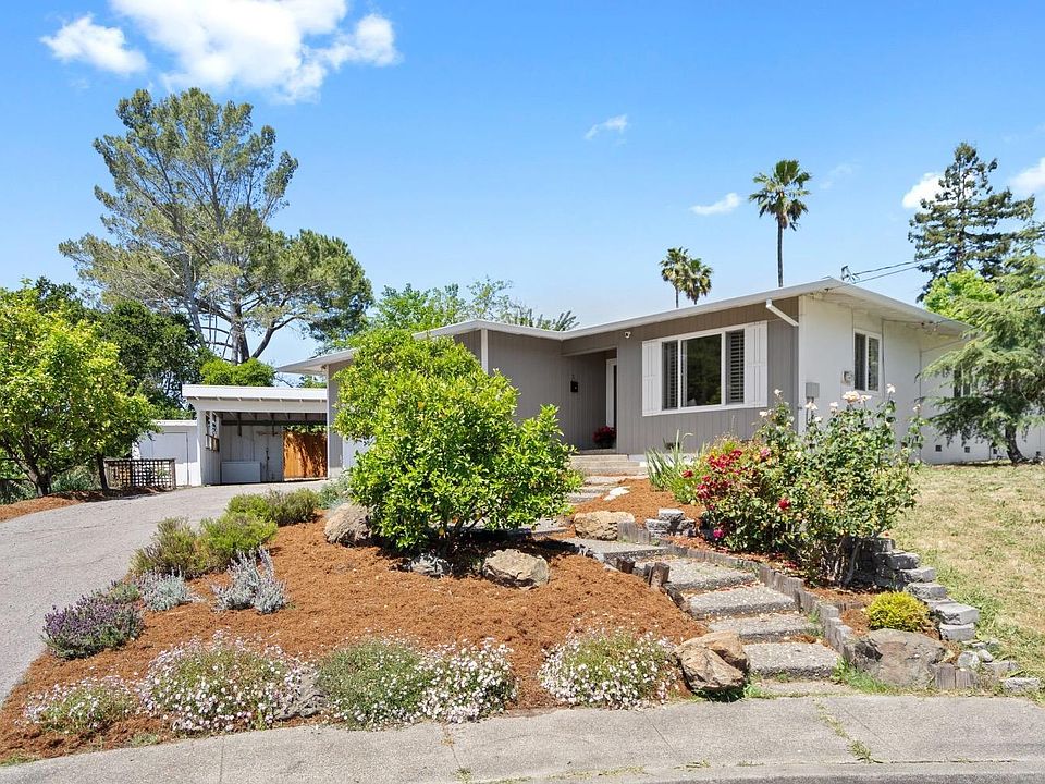 From the calm cul-de-sac, look up at the flowered walkway into the front of this inviting home. As you step through the doorway, you'll be greeted by a versatile living space adjacent to the entryway and a charming reading nook. The open concept takes you into the kitchen and dining area. In the kitchen, stainless steel appliances are complemented by a skylight, letting in natural light and flowing into the dining area. Down the hall you'll see a fully remodeled bathroom on your left, fitted with dual sinks and a spa-like bath/shower. As you continue, you'll come across three spacious bedrooms. The primary suite comes with an en-suite full bathroom. Make your way around the house and through the carport, a perfect workshop or vehicle bay. Being the largest lot on the cul-de-sac at 15,694 square feet, there is abundant space for the sun filled back patio and lawn. Make your way to the pool area, where a beautifully landscaped hillside make a great spot for memorable summers.
