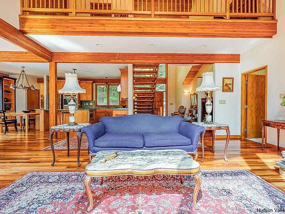 This spacious and gracious custom contemporary is privately set on a dead end road only 2 miles from the Village of Woodstock. Seasonal views of the Catskills, Ashokan Reservoir and Hudson Valley could be expanded to year round views with selective clearing. Open floor plan incorporates elegant architectural features such as an cathedral ceilings, impressive two story stone fireplace, huge windows, gleaming Brazilian Cherry floors, generous first floor primary bedroom and bath, gourmet kitchen with breakfast bar and custom built in recessed shelves and kitchen table. The dining room area is open to the living room and kitchen with two sets of glass doors that lead to a great entertaining deck. The perfect bonus room is tucked on the far side of the kitchen with glass doors to the deck and lots of space for whatever use your heart desires, family room, home office, gym or art studio. After ascending the hand crafted staircase to the second floor there is a picture perfect curved alcove that invites you to relax with a warm drink and a good book. Two additional spacious bedrooms with vaulted ceilings and country contemporary style bathroom complete the second floor. The lower level is a huge unfinished space that is walk out and just waiting for your imagination. Exterior siding is cedar and a large flat area is to the right of the house. A little TLC and some landscaping would make this gem really shine.