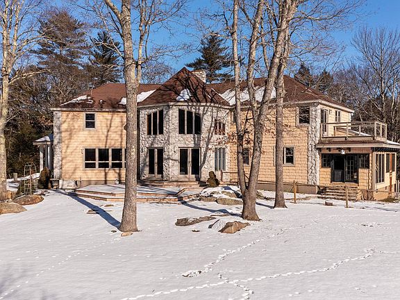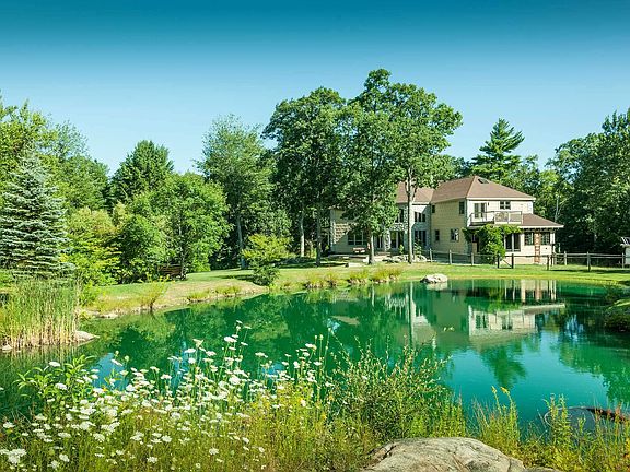 At the end of a quiet road in a cleared private oasis lies one of the most unique properties in Cape Neddick. Situated on 6.8 acres, this contemporary home boasts notable craftsmanship and intrigue. The main level is highlighted by a grand 25-foot vaulted great room with a dramatic granite chimney with Russian soapstone woodstove replete with pizza oven. The room is surrounded by oversized windows and doors flooding the main living area with natural light. Through the doors, the expansive tiered deck overlooks the beautifully maintained landscape with a man-made natural pond, goldfish pond highlighted by natural outcroppings of rock and ledge. The formal dining room with Australian Cyprus flooring and a spacious custom eat-in kitchen with center island and walk-in pantry, make for easy living and provide ample space for entertaining. Completing the main level is a bedroom with en-suite full bath and access to the 4-season sun porch overlooking serene forest views. Following the stairway to the second level, the landing is open, overlooking the great room, and is host to built-in shelving, a gas woodstove, and makes for an ideal space for a library or home office. Also on this level is the intriguing primary suite, featuring an expansive walk-in closet, an in-room 7-head glass shower unit, and a private balcony overlooking the natural pond. Two additional bedrooms sharing a full bath, complete 2nd level.