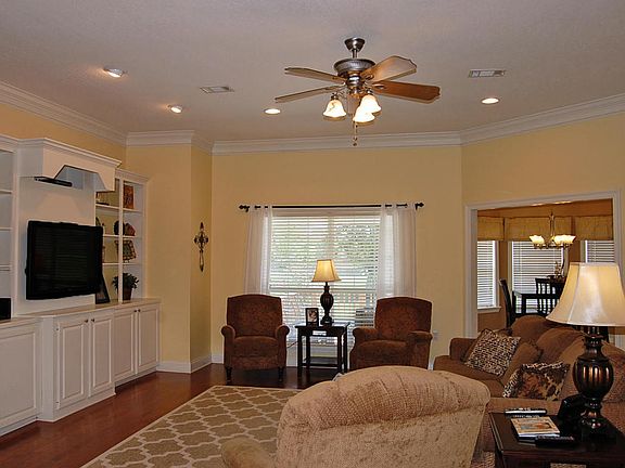 Ultra-pristine home in Pecan Lakes on the lake with circle drive and loads of curb appeal! Open split plan with hardwood floors in Great Room and Foyer. Bright, airy Kitchen features work island and stainless steel appliances. Enjoy fishing and sunsets over the lake from the covered patio and deck.
