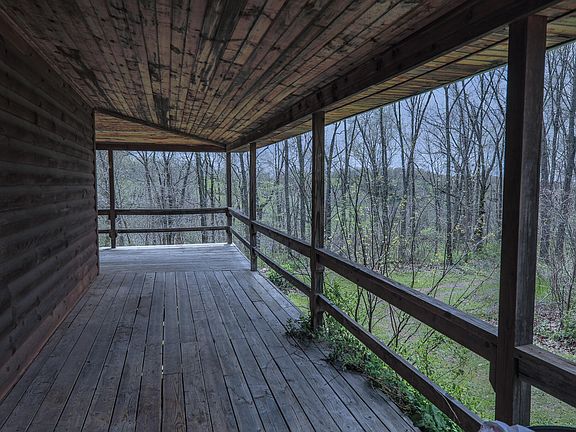Custom built cabin-style home on 6.5 secluded acres with a WALKOUT basement and storm shelter! As you enter the main level through the gorgeous wrap-around porch, you'll enjoy the space of the open concept kitchen/living area. The main floor has 2 bedrooms: a master suite with a 'his and hers' closet and private exit from the porch and a second bedroom with 3 (yes, you heard right, 3!) closets for extra storage. Venture down the stairs to the basement, where you'll find a finished storm shelter and a large non-conforming bedroom. The rest of the basement is left unfinished, ready for YOU to decide how to best use the space. Lots of natural lighting all around! Detached garage has 2 overhead doors and plenty of space for those projects you've been putting off. HVAC is 1 year old, metal roof is 5 years old. Home is vacant and move in ready.