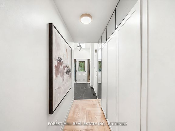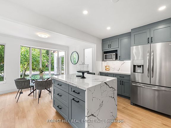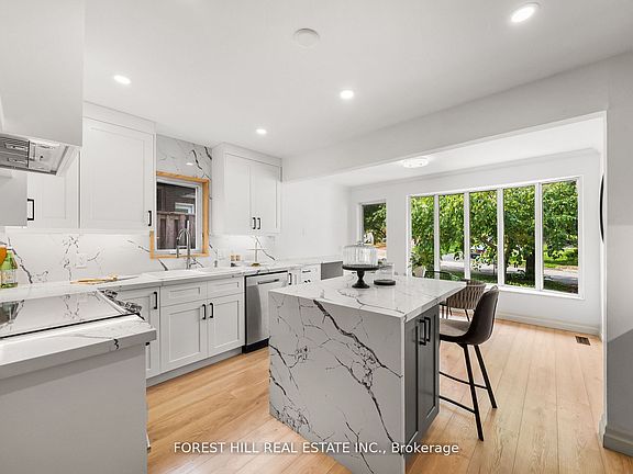 Mature treesNew wood deckSoaring two-storey vaulted ceilingsLarge windowsRenovated eat-in kitchenQuartz countersWaterfall island