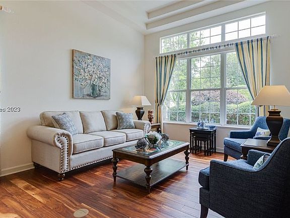 Fabulous Del Webb Estate (Adams) @2, 275 SF living space. 2 bdrms, 2.5 baths, plus office library. Meticulously maintained private backyard paradise w .water feature. Lagoon across quiet 3 home cul-de-sac. Brick trim front + Golf Cart Garage. Includes, 12 smooth ceilings, transom and bay windows, 6 plank hardwood floors throughout, Eat-in kitchen w maple cabinets w glass inserts, granite counters and SS appliances. Carolina Rm w Electric fireplace opens to screened lanai. Spacious master suite w separate shower and soaking tub. Large guest site w private bath. New Roof 2021, SOLAR Panels 2021, 4 ton Heat Pump. Amazing, move in ready paradise!