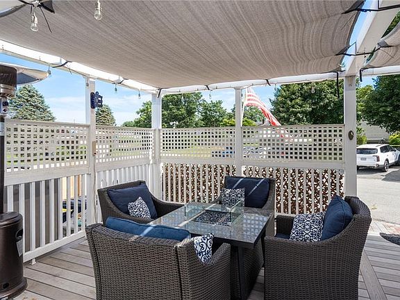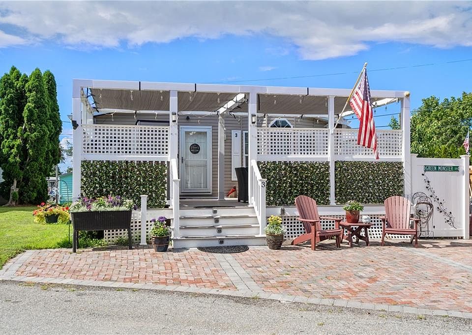 Move In Ready: Check out this impressive and large manufactured home 56 x 28, three bedrooms and two bathrooms with 18 x 24 composited deck with vinyl railing in excellent condition. Many upgrades include paver driveway, new roof with gutters, new hot water tank and new fence. Open concept encompasses the living room with stoned gas fireplace, eat-in-kitchen with room for five bar stools at the breakfast bar, with beautiful detailed windows and new wall to wall cabinetry with tile backsplash in the dining area. Dedicated laundry room. There are ample closets with shelving for storage. The primary bedroom has walk-in closet and en suite bathroom. Propane heat for home, fireplace and stove. Home also has central air conditioning. There is also a 10 x 12 shed with electric. The home is wired for a generator with 200-amp service and 50-amp service outside out front. Lease land rent includes professional management service, water, sewer, paved streets, fully lighted streets, trash and recycle pickup and snow removal. All complete with landscaped lot. Pet friendly. All applicants must obtain park approval for residency prior to closing.