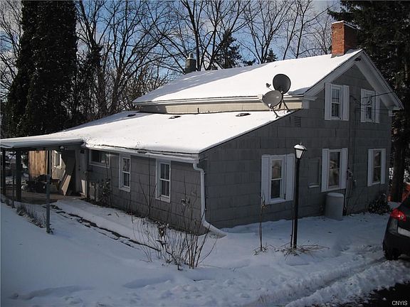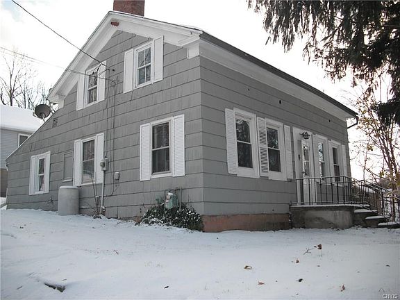 Partial basement with dirt floor but in good condition. Basement also has inside/outside entrance. First floor eat-in kitchen, modern bath, dining room, family room, living room. Property has replacement windows, covered patio, detached garage and washer/dryer hookup in kitchen.