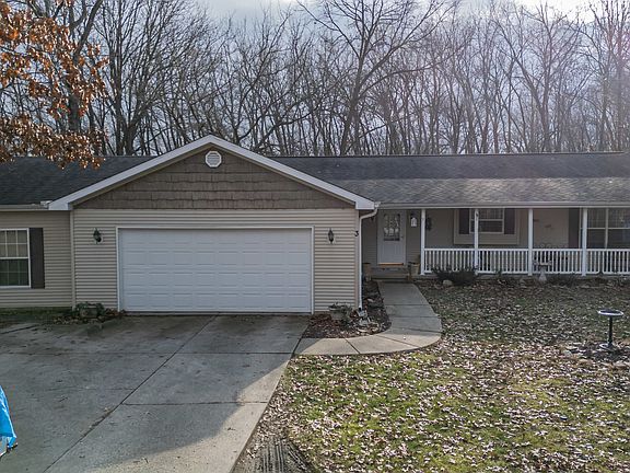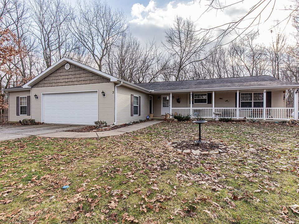 Welcome to this charming 1-story ranch nestled into a secluded portion of the Lake Thunderbird community. With 3 bedrooms and 2 bathrooms, the modern layout offers the perfect blend of convenience and comfort. The large, open living space, highlighted by a gorgeous wood-burning fireplace, flows seamlessly into the dining area and kitchen. The master bedroom features an en-suite bathroom with double vanity, walk-in shower, and whirlpool tub, plus a walk-in closet with entrances from both the bedroom and bathroom. The large basement is waiting to be finished, with tons of potential for additional living space and a 3rd bathroom. The 2-car attached garage includes a large workspace with a convenient service door in the rear. Relax on the back deck and take in the sights and sounds of nature, as the tranquil setting is ideal for nature lovers. Updates include brand new furnace & central A/C in Oct. 2023, new shed in 2020, flooring throughout in 2019, and water heater in 2018. All kitchen appliances and washer/dryer stay. With only 1 owner since it was built in 2005, this wonderful home is ready for its next chapter. Call for a showing today!