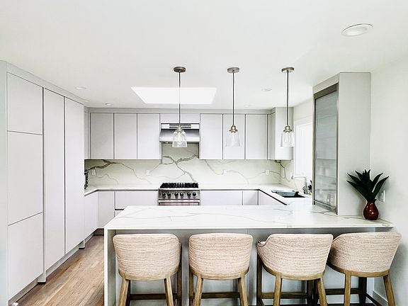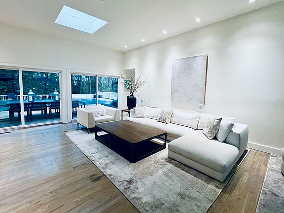 This bright, modern, totally renovated 4 bedroom, 3 bathroom, home with a pool, is nestled on just shy of an acre on a quiet little cul-de-sac in Quogue. Enter into an expansive great room with soaring 12' ceilings, skylights, and floor-to-ceiling windows that fill the house with natural light. The contemporary interior features open living spaces. The kitchen is designed with custom self-closing cabinetry and brand new high-end appliances including a Thermador refrigerator/freezer, Viking range/oven, Bosche dishwasher and quartzite countertops. There is a casual counter with RH stools for cozy breakfasts and a Calligaris glass dining table and chairs. The primary bedroom has a king-sized bed and sliding glass doors opening to the deck. The en-suite bathroom has gorgeous marble-lined double sinks, an oversized 3-head shower and soaking floating tub. The guest bedroom has two full size beds and a tastefully updated en-suite bathroom. A separate wing includes two additional bedrooms with a shared bathroom, offering privacy for guests, one bedroom has a full-over-full bunk bed with trundle, while the other has a full size day bed with pull out trundle. The home features grey oak hardwood floors throughout, and is tastefully furnished with brand new, bright and beachy Restoration Hardware furniture and lighting. The living room has a wood burning fireplace and sliding glass doors opening to an expansive natural wood deck with a 20'x40' heated pool. Relax outside and enjoy the large sun-filled deck area with outdoor dining and seating options perfect for entertaining, or just sit on the front porch and relax your summer away. In addition, there is a patio area out back with Adirondack chairs, fire pit, outdoor table tennis, as well as a half-sized basketball court. Additional amenities include, central air conditioning, remote controlled roller shades, Sony 85" Smart TV, Sonos sound system, Apple TV, Alexa smart home system, Dyson vacuums. The home is outfitted with a Ring security system, including 3 exterior security flood cameras and a video doorbell. Wi-Fi extends throughout the house and the pool/patio. Outdoor area includes 10-foot trampoline. Great location, just 2 miles away from the gorgeous Quogue Village beach with various amenities including private locker, snack bar, restrooms, showers and a playground. Also within close distance is the Quogue Wild refuge, a 305 acre nature preserve offering seven miles of walking trails, a nature center and full slate of events throughout the summer. Sportime Quogue is a year-round full service tennis, fitness and sports facility just a few minutes away. Enjoy this perfect Hampton Summer rental located close to all.