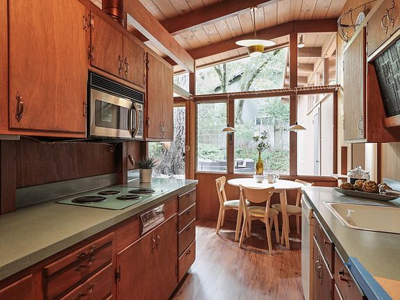 Mid Century Dream - Tucked in Emerald Hills, this Mid Century Modern 3 bedroom, 2 bathroom home is awash in iconic architectural detail and a natural setting with stunning mature trees. Cathedral ceilings, exposed wood beams, large plates of glass and vintage charm, including modular shelving and hardwood floors, bring warmth and style. Open concept living room and dining room w/ fireplace and views of expansive yard. Iconic Mid Century architecture like exposed beam ceilings, modular shelving, large plates of glass. Perfect floor plan separates living area from bedrooms. Master suite w/ long closet, hardwood floors and new en suite bath. Two large bedrooms with long closets and bright windows. New guest bath w/ shower over tub, new vanity.