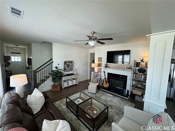 Modern Farmhouse-style townhome in the popular Cannon Trace community. This up-to-date home exudes elegance and comfort with upgrades in abundance. The open floorplan on the main level joins the kitchen and living spaces in perfect harmony. Add to this the private fenced back patio and you have a great entertaining space. This one is an end unit so it has added windows making it extra bright and cheerful. The kitchen features a gas stove, custom cabinets, recessed lighting, quartz countertops, and stainless steel appliances. The oversized master suite is on the upper level and features a trey ceiling and sitting area. The master bathroom boasts a double vanity with quartz tops, custom hardware, tile flooring, and a soaking tub. There are two additional bedrooms, a loft and a second bath in this spacious split bedroom plan. Plenty of room for an office and guest accommodations. Cannon Trace is well located near everything in Winder and close to I-85 and Hwy 316.