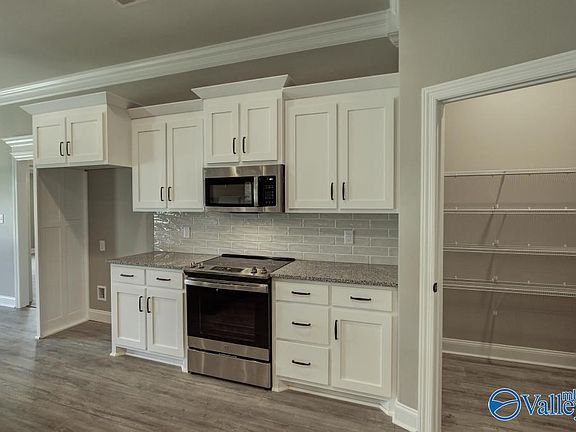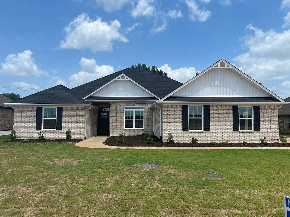 All brick Dogwood Creek Plan B is an open plan with a 3 car side entry garage and is backed by a 2-10 home warranty.. Upgrades:NO CARPET - REV-WOOD in all bedrooms.Granite in all bathrooms.Pendant lights.Home has 4 bedrooms and 3 baths plus dining room. Great Room features 10' ceiling, extensive trim, gas-log fireplace, wood plus flooring, recessed lights and ceiling fan. Dining room has 10' ceiling, wood plus flooring and extensive trim including shadow box under chair rail. Open Kitchen includes 10' ceiling, custom cabinetry with granite counter tops, large 45 degree island with raised bar seating, stainless appliances, tile backsplash, wood plus flooring, recessed lighting, and pantry. Breakfast has 10' ceiling, wood plus flooring and extensive trim. Master bedroom has a double tray ceiling, recessed lighting, extensive trim and ceiling fan. Master bath has 10' ceilings, glamour tub with tile surround, large tile shower with shower door, separate toilet area, double vanity and walk-in closet. Laundry has custom cabinet and tile flooring. Home has a covered back porch. Home includes a fully sodded yard, gutters including piping under sidewalks and attractive landscaping. Wood Plus Flooring is REV-WOOD. Builder has a closing cost program.