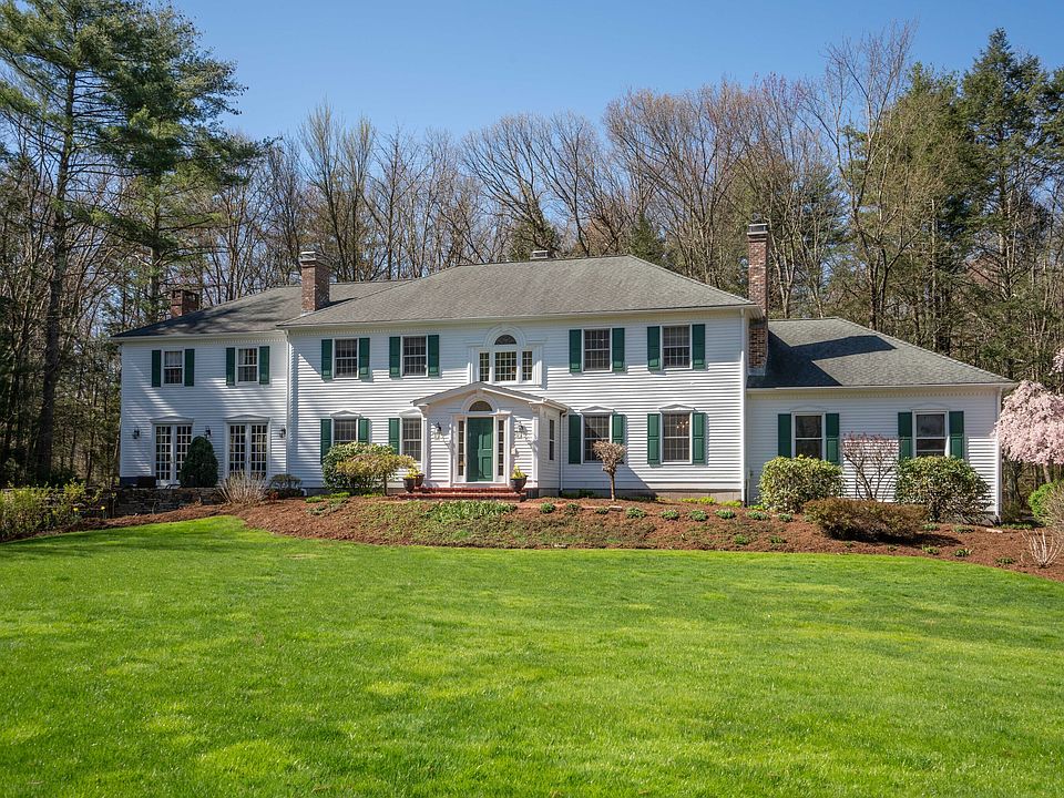 Welcome home to this picturesque colonial nestled on 2+ acres. The gracious two-story foyer welcomes you to an elegant dining room and living room with custom millwork. Thoughtfully designed for everyday living, the granite kitchen with center island, pantry and exposed beams shares a double-sided gas fireplace with the family room featuring a wet bar that is perfect for entertaining guests. Retreat to the stunning library and sit by the fireplace or step through the French doors and relax on the blue stone patio. Two staircases lead to the 2nd floor which continues to impress. The stunning primary suite offers a sitting room w/ fireplace, double walk-in closets and a luxurious remodeled bathroom complete w/ two vanities and tile shower. Four additional bedrooms, three w/ updated ensuite baths and a home office complement the upstairs of this beautiful home. Step down to the walk-out LL w/ large game room and additional rec room. Enjoy your morning coffee on the sun-filled porch overlooking the private yard or sit on the patio with views of the expansive lawn that is adjacent to Simsbury Land Trust property. Recent improvements include a new HW heater, porch flooring, rebuilt chimneys, new driveway, newer heating, ac and septic systems. Situated on a quiet cul-de-sac this meticulous home is close to hiking trails, Penwood State Park, Heublein Tower, and is located in an award-winning community with a short commute to Hartford, Farmington and Bradley Int'l airport.