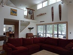 Stunning architecturally-designed home, bathed in light with walls of south-facing windows looking out at the perfectly private landscaped yard, woods, and treetops. Inside are soaring ceilings, open floor plan, great kitchen-granite breakfast bar opens to dining & sunrooms. Bookcase-lined loft overlooks well-windowed living room w/ gas fireplace and French doors to new office. New garage & workshop. Terraced landscaping w/ water features and tiered decks, all very close to Cornell on a sweet cul-de-sac.