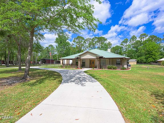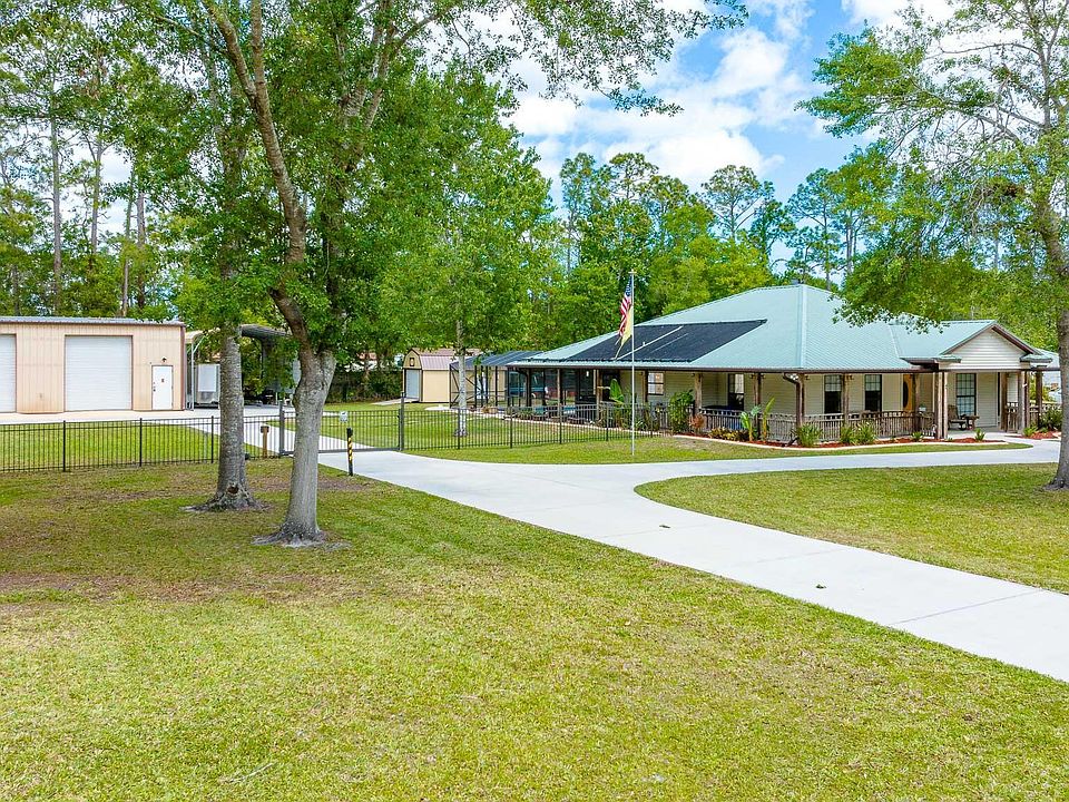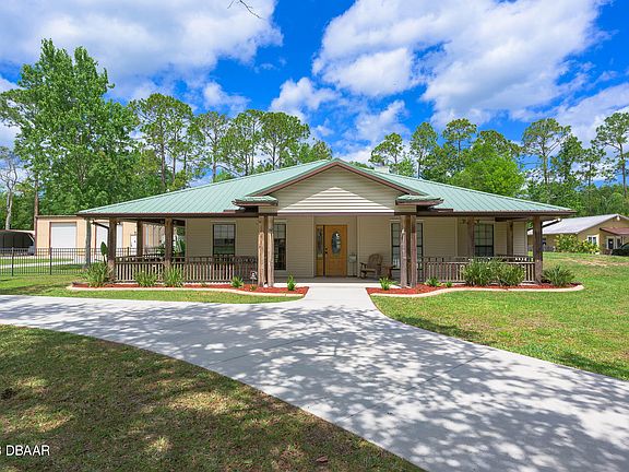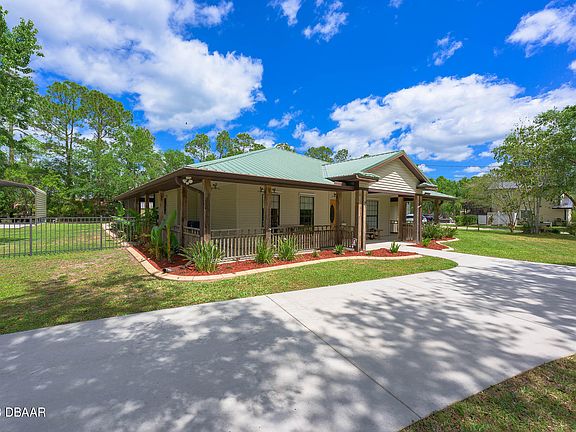 Enjoy peace and quiet on this more than 1 ACRE property complete with SCREENED POOL and AIR CONDITIONED WORKSHOP! This private country estate features a gorgeous 3bed/2bath home with a relaxing wrap-around porch, METAL ROOF FROM 2021, newer pool installed in 2015, and open concept living/dining/kitchen perfect for entertaining. Living room is accented by a wood-burning fireplace and vaulted ceilings and centrally connects the spacious kitchen with eat-up bar and island, the dining room with sliders to the lanai, and a bonus room that makes for a perfect office or pool bar. The master suite has its own wing of the house with double walk-in closets, laundry nook, and updated tile shower. The 1200sqft SHOP has AC, epoxy floors, 2 bay doors, loft, and two extra carports on either side!