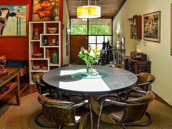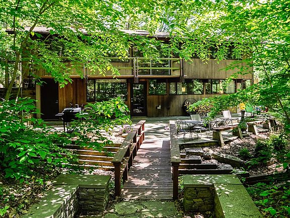 Exceptional four bedroom, two bath contemporary on stunning 1.05 acre lot in Ellis Hollow. Beauty and light everywhere the eye lands: cathedral ceilings, sky lights, walls of windows open to secluded nature, the sound of your own private waterfall from the upper deck and custom stone patio; Zen-inspired bridge over stream. Contemplate and regenerate, or host inspiring get-togethers in this unforgettable setting. Impressive list of recent improvements includes all-new appliances, custom blinds, mini-split for AC, leaf-filter gutters and newly leveled/filled driveway. Just minutes from Cornell, Ithaca College, and downtown Ithaca. One of a kind.