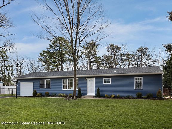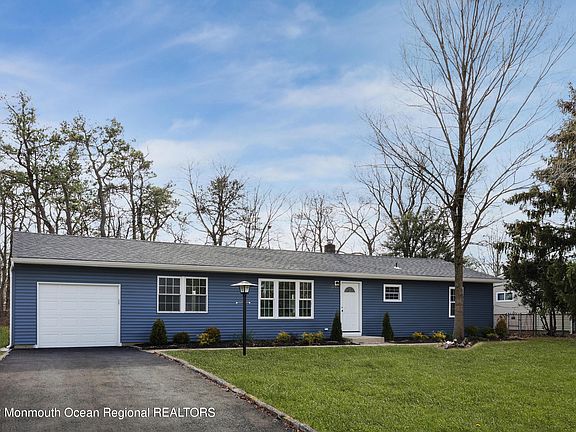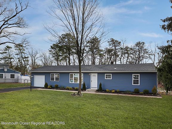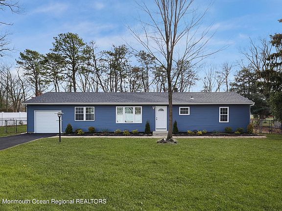 BRAND NEW SEPTIC, Completely renovated ranch in the desirable Ramtown Section of Howell. Home boasts 3 bedrooms and 2 full baths and attached garage with direct access. Gleaming and durable wood impression vinyl flooring and recessed lights throughout. Beautiful bright open floor plan featuring living room, dining area and kitchen with white cabinetry, stainless steel appliances, granite countertops, center island and slider leading out to patio viewing oversized yard. Tastefully tiled bath with neutral colors. New roof, siding, windows and driveway.