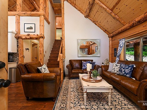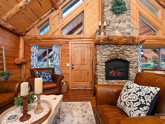 Introducing a one-of-a-kind hand-hewn log cabin nestled in the coveted Castle Mountain subdivision of Garden Valley, ID. This exquisite residence, in close proximity to the Terrace Lakes Golf Course, boasts three generously sized bedrooms and an additional loft/sleeping area, seamlessly blending rustic charm with modern functionality. The open-concept great room and kitchen are anchored by a breathtaking hand-set river stone double-sided fireplace, creating an inviting ambiance. Step outside to a large covered patio, where an additional fireplace enhances the outdoor living experience. Enjoy panoramic sunsets over the adjacent pond, offering a serene backdrop for relaxation. With ample parking and space for further outbuildings, this home comes fully furnished and epitomizes the tranquil mountain lifestyle.