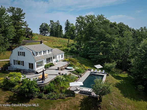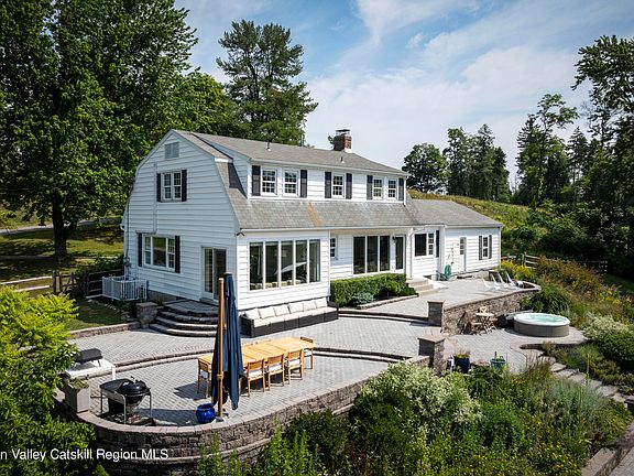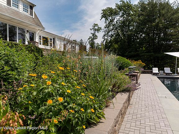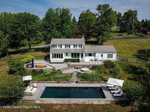 This carefully curated and updated home in Rhinebeck features a beautiful eat-in kitchen, two living spaces on the main floor with a wood-burning fireplace, along with a two-car garage and office space. Upstairs you'll find the primary with en suite bathroom plus two additional bright bedrooms and a guest bathroom. The standout feature of the house is the gorgeous inground saltwater pool, flanked by mature perennial gardens and views of the Berkshire mountains. Located just minutes from the center of Rhinebeck and close to Red Hook and Kingston, you have easy access to all kinds of events, restaurants, and outdoor activities. This home offers both tranquility and convenience with a 12 min drive to the Amtrak station in Rhinecliff and a 1 hour and 45 min drive to NYC.