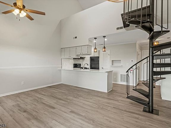 Stylish light fixturesPrivate balconyRecessed lightingSleek spiral staircaseLarge windowsUpdated cabinetryClean white tile backsplash