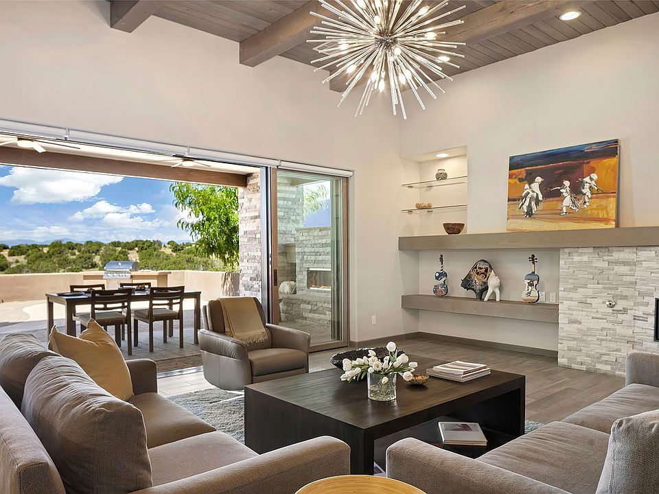 Live the Ultimate Las Campanas Lifestyle. Perfectly sited on a premier elevated lot with Jemez Mountain and dramatic sunset views, this exciting 2022-built residence with a private casita and 3-car garage is a rare offering. Located within walking distance of The Club at Las Campanas, this exceptional home seamlessly blends sophisticated modern design with the true essence of Santa Fe. The gated front entrance opens to an intimate courtyard with a tranquil fountain, which connects the main home and casita. Thoughtfully designed, this floor plan highlights a spectacular living room ideal for both relaxed living and grand entertaining with western views which frame the space, rich wood plank and and beam ceiling accents, a modern gas fireplace with surround stacked stone, wet bar or barista area and retractable glass doors which create a true indoor-outdoor living experience. The chef’s island kitchen is a delight, featuring natural stone counters, a generous breakfast bar, Wolf 6-burner range with double ovens and griddle, a Wolf wall oven and microwave, Sub-Zero refrigerator, dual dishwashers and a large walk-in pantry. This culinary haven flows into a gracious dining room with mountain views and designer lighting. The private, luxurious primary suite offers beautiful Jemez Mountain views, a cozy sitting area with fireplace and a spa-inspired bath with a soaking tub, walk-through shower, dual vanities and a custom walk-in closet. Separate from the main living areas are two guest suites, each with ensuite baths, which share a secondary living area or media room. The dedicated office with courtyard views provides an ideal work-from-home setting, while the separate casita with a 3/4 bath is an ideal guest quarters or studio. Outdoor living is elevated with multiple entertainment areas, a covered portal, two outdoor fireplaces and a built-in BBQ. This special home with smart-home technology and soft natural light throughout, defines excellence and is not to be missed.
