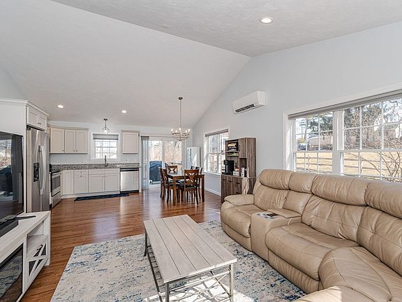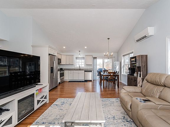 Step into modern living with this energy-efficient, electric home, meticulously crafted in 2022. Designed with year-round comfort in mind, each room is equipped with a ductless mini-split system. The main level captivates with its hardwood flooring, flowing seamlessly through an open-concept living room and eat-in kitchen area, both crowned with a striking vaulted ceiling. The kitchen dazzles with its SS appliances, granite, and a separate dining space, ideal for gatherings. The primary bedroom suite offers a private sanctuary with a full bathroom, while the second bedroom is generously sized and is served by the full guest bath down the hall. Venture downstairs to discover a massive room, currently utilized as a home office and family room, complete with a convenient 1/2 bath. The lower level also hosts the laundry area, smartly positioned for ease and efficiency. The convenience extends outside with a 2-car garage and a massive driveway for entertaining. *Offer deadline: Monday 6pm.