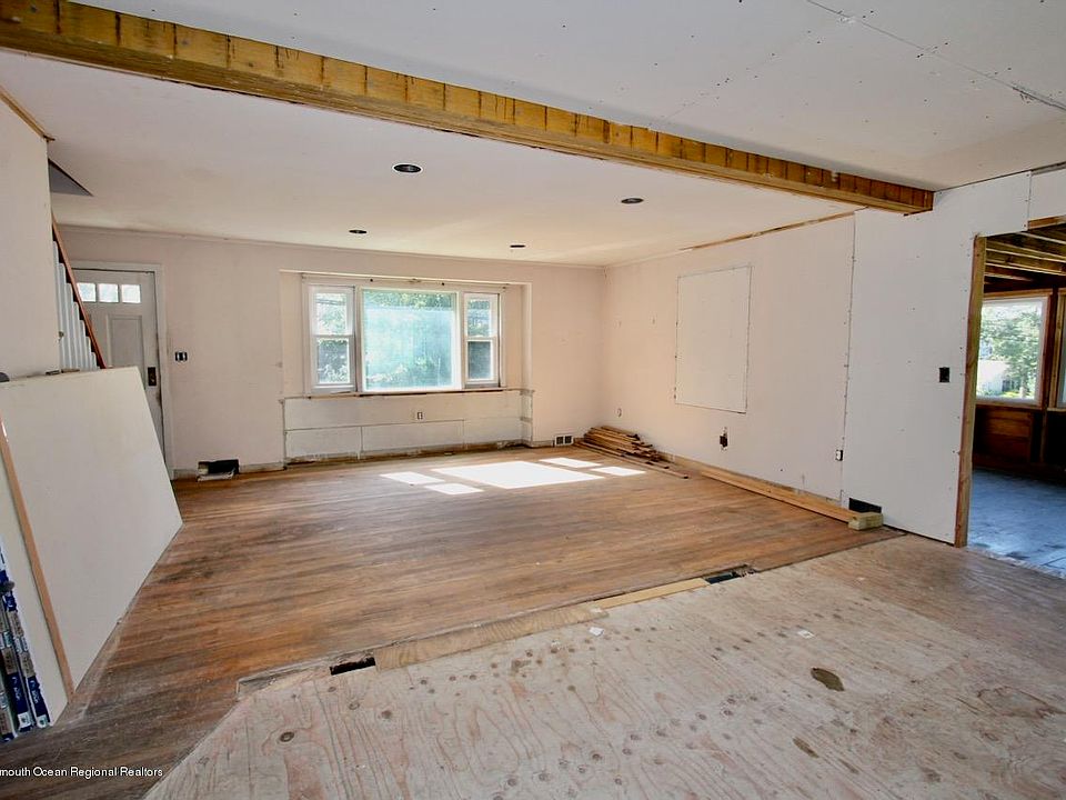 Enjoy seeing the sun setting on the Shark River from your own home! This cape has been gutted for an open layout, has new windows and new siding and is ready to be completed. Wonderful 12 x 27 great room has elevated views of the river and a vaulted ceiling. Incredible location as it is steps to the river, 2 miles to the beach and boardwalk, and only 1 mile to Memorial Park where you can kayak, paddleboard, and enjoy more spectacular views of the Shark River. This oversize property has a private back and two large side yards. Close to major commuting roads, and bus and train service to NYC. Property is being Sold As-Is and the buyer is responsible for the CO.