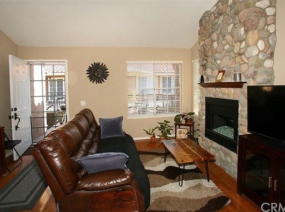 Great first home or investment! Turnkey Rancho Santa Margarita Condominium Community featuring popular "Carriage Unit" (no one above or below). End unit. High Vaulted Ceilings in the Master bedroom, living room and dining area. Cozy stone fireplace in the living room, fireplace is decorative only. Updated wood floors. Smooth ceilings. All appliances stay including new washing/dryer machine. One car garage. 2 comfortable patios (one from the entrance and the other of the master bedroom. Close to schools, restaurants, shopping, Rancho Santa Margarita Lake and Beach Club and community pool and spa.