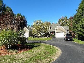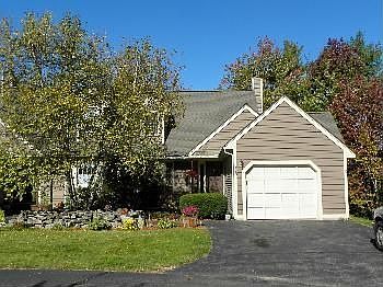 Listing agent: Chip Sutton, Call 603-845-2130 for information. Built in 1988, this handsome 2 bedroom 2 bath Cape style Condo is located in the beautiful Villages at Chester. The Villages boast many amenities such as inground pool, tennis court and meeting house. The monthly fee of $325 covers water, sewer, road maintenance, landscaping, snow plowing and trash removal. Coming into the Villages past the well landscaped entrance and sign you weave through the paved lanes with clusters of Condo units on dead end circles. Unit 30 is on a quiet circle surrounded by trees. The unit has a paved driveway/parking area and a one bay attached garage. Entering the home from the front porch you step onto the hardwood floored foyer. To your left is the eat in kitchen(9x18) with ceramic tile floor, maple cabinets, Corian counter tops, stainless steel appliances which include electric flat top range, oven, mircrowave, dishwasher and refrigerator. The bumpout dinette area is bright and inviting. Off the kitchen is the open concept dining room/living room(14x25) with hardwood floor, hanging light, attractive support columns and cozy granite hearth wood burning fireplace. There is a slider from the living room to the deck overlooking the wooded back yard. Down from the foyer is the first floor master bedroom(13.5x15)with wall to wall carpet, cathedral ceiling with fan/light, walk in closet and slider to the same deck that opens to the living room. There is also a first floor bathroom with tile floor, corian counter top and fiberglass tub/shower as well as a first floor laundry with electric washer and dryer behind mirrored slider closet doors. The door to the attached garage is off this floor as well. The garage has plenty of storage and auto door opener. Up the carpeted stairs from the foyer is the second floor landing/loft area(8x12) which makes a nice sitting room of small den. Off this loft area is the second floor bedoom with Berber carpeting, double bifold closet with storage dormer, overhead fan/light and rear dormer overlooking back yard. The second floor large bathroom has ceramic tile floor, Corian counters, maple vanity and fiberglass tub/shower. Down in the basement is a huge finished area (8x16+13x23) with Berber carpet, deep closet and slider to rear yard with granite tile threshold. This area could serve as a family room, game room or bedroom. Many possibilites. The unfinished area houses the FHA gas furnace, gas water heater, central AC and 200 amp electric service. There is also a small finished study off the utility area. Taxes for this home area about $4250/yr. as the home is assessed at over $240,000. This listing is a "Short Sale" and subject Lender approval. Call us today if you would like a showing.