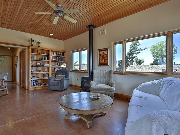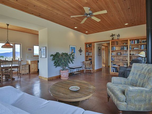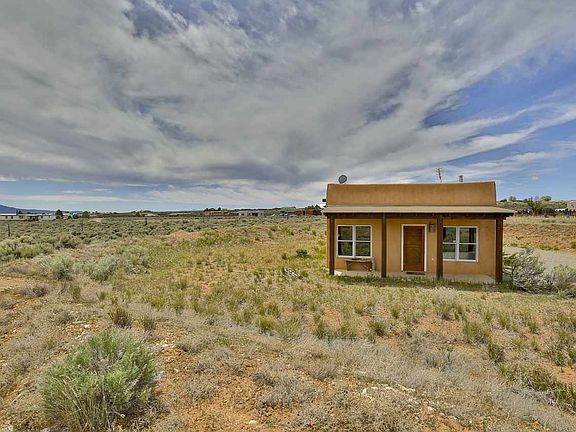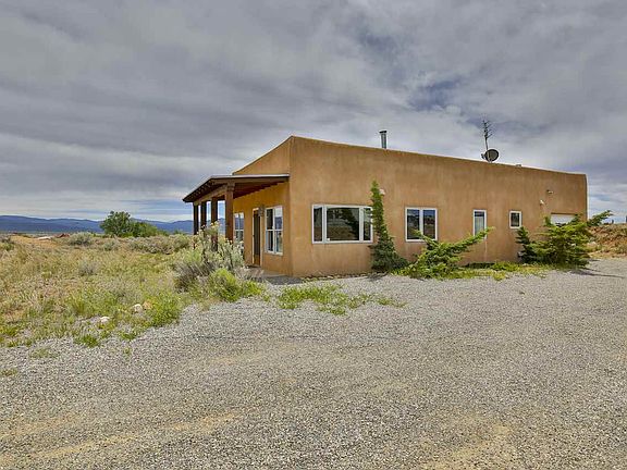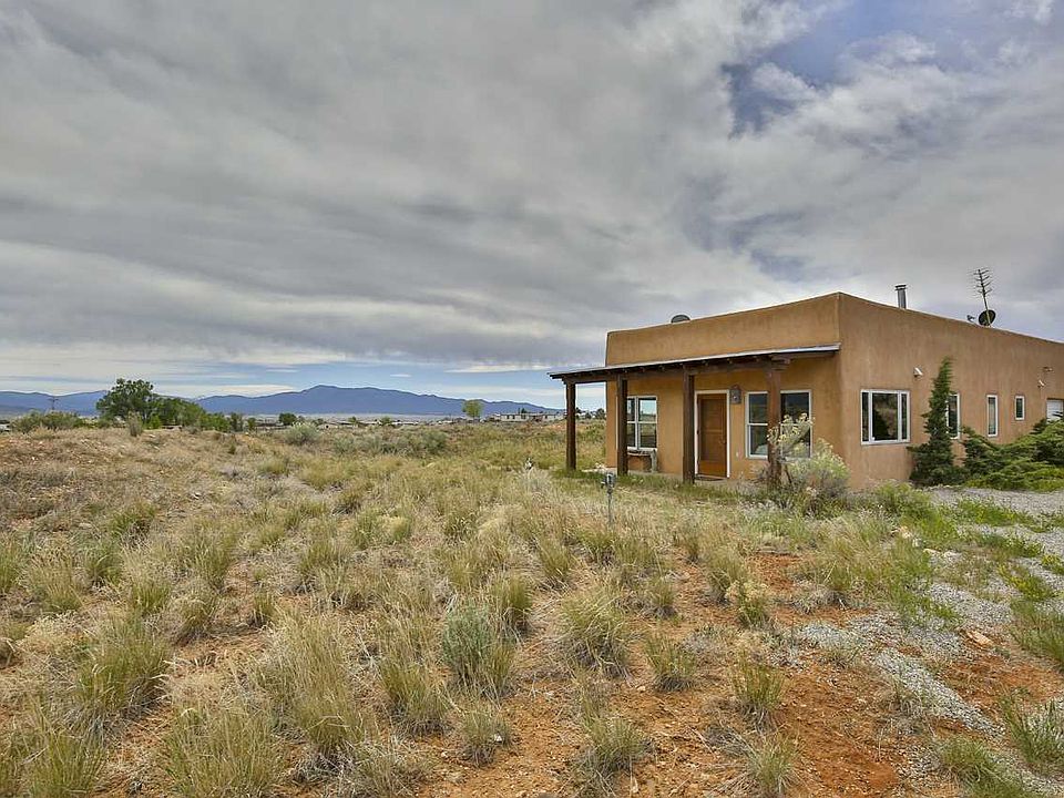 A beautifully designed, beautifully sited, superbly maintained 1 bed/1bath pueblo style home that comes with a generous 1 car attached garage. Built by one of Taos best builders, Ken Wolosin, this house sits behind a privacy berm and gives you dramatic views of Taos Mtn, and then across the the Colonias Valley to the Picuris range. This home comes with tongue and groove ceilings, picture windows on three sides with hardwood sills, hardwood baseboards, custom pine cabinets, stained concrete floors, tastefully neutral tile in the kitchen and bath, a propane powered gas-log fireplace and ample storage in the garage. Plumbed with radiant -floor tubing in the slab, should the future owner want to expand, this affordable and high-quality home is perfect for an artist, a young family or a retiree. Easy living in Taos doesn't come better than this. Vacant and easy to show.