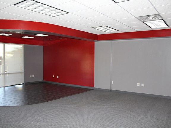 Open office space with three private office areas, two bathrooms and a bonus area for storage.