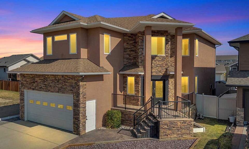Welcome to 3 Trump Place—an exceptional, fully developed executive home located in one of Red Deer’s most desirable, private closes. This 4-bedroom plus den, 3.5-bathroom residence is the perfect blend of timeless elegance and modern design, offering superior craftsmanship and luxurious details throughout. From the moment you arrive, the curb appeal is undeniable. The grand double iron doors open into a dramatic two-storey foyer adorned with granite flooring and an abundance of natural light. The attention to detail is immediately evident in the custom finishings, upscale materials, and thoughtful layout designed for both family living and entertaining. The chef-inspired kitchen is as functional as it is beautiful, featuring rich cherry wood cabinetry, granite countertops, high-end appliances, and a large island with eating bar. A walk-in pantry, full tile backsplash, and undermount sink elevate the space. The adjoining dining area offers access to the covered deck and beautifully landscaped backyard, perfect for outdoor gatherings. The open-concept great room is anchored by a floor-to-ceiling stone fireplace flanked with custom maple shelving, creating a warm and inviting atmosphere. A private main-floor office with French doors, a convenient 2-piece powder room, and a spacious laundry room with built-in cabinetry and a sink complete the main level. Upstairs, the spacious bonus room overlooks the main living area, while the serene primary suite offers vaulted ceilings, large windows, a walk-in closet with built-ins, and a spa-like ensuite featuring a soaker tub, oversized tiled shower, double vanity, and separate water closet. Two additional bedrooms and a beautifully appointed full bathroom are also located on the upper level. The fully finished basement features in-floor heat, granite tile flooring, 9-foot ceilings, a large family room with wet bar, fourth bedroom, a separate den, and a full bathroom. This level adds both comfort and flexibility to suit your family's needs. Additional highlights include air conditioning, built-in sound wiring and high speed cat 5 wiring for high speed gaming etc., solid wood doors, premium light fixtures including chandeliers, and a heated, finished double garage. The backyard is fully fenced with vinyl, offers back-alley access, and includes a firepit area and storage shed. Ideally situated within walking distance to schools, playgrounds, parks, churchs, and all the amenities of both Timberlands and Clearview Market Square, this property combines the best of location, luxury, and lifestyle. Homes of this calibre and setting rarely come to market—experience the quality and attention to detail for yourself at 3 Trump Place.