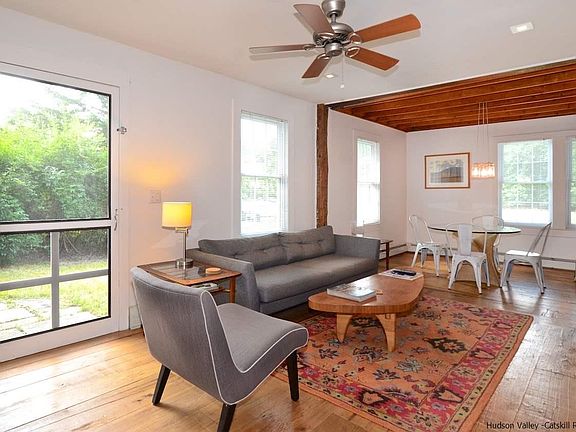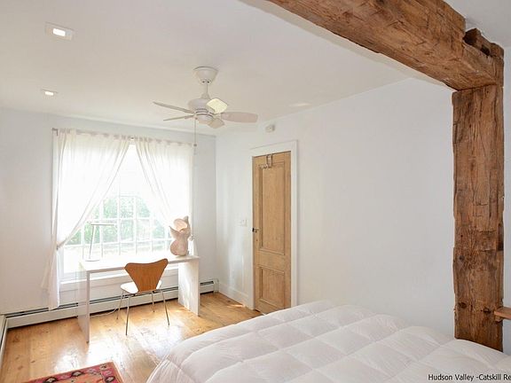 Wow. Woodstock pristine, completely renovated country cottage with wide board pine floors, historic beams and upscale modern high-end finishes. Kitchen with honed granite counters and stainless steel appliances. Ground floor Master bedroom has large open closet with organizers. Bath is exceptional with glass frameless shower, all-white marble surround and curved marble sink, an artist designed marble tile floor mosaic, and radiant heat. There are two guest bedrooms upstairs, nicely separated with a hall and additional closets. First floor laundry room. There is a Bluestone patio for BBQ or relaxing with a built-in honed bluestone table and benches. Cottage feels perfectly private surrounded with an expanse of green fields. Easy access to NYC bus route. Your perfect place to get away from it all, yet just a few minutes to the fun and entertainment of Woodstock Village center.