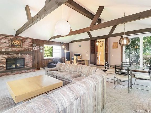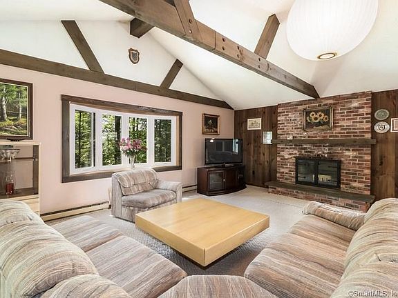 Large well kept 2,600 square foot 4 bedroom raised ranch. 23'x23' living room has vaulted ceiling, beams, brick fireplace and slider to deck. 3 bedrooms on main level, full bath with vaulted ceiling and skylight. Lower level 1,000+ square feet has bedroom and full bath for family or guests, office, den and laundry room. Two level deck overlooks shady back yard. Newer features include; septic, windows, slider, roof, vinyl siding, garage doors and water heater. Nice level yard. Close to Candlewood Lake, Brookfield town beach and shopping.