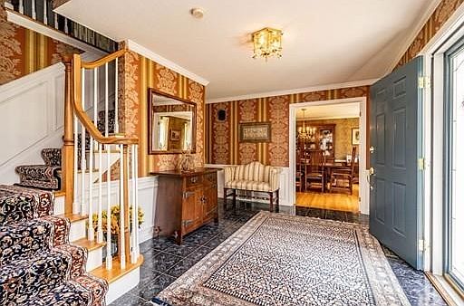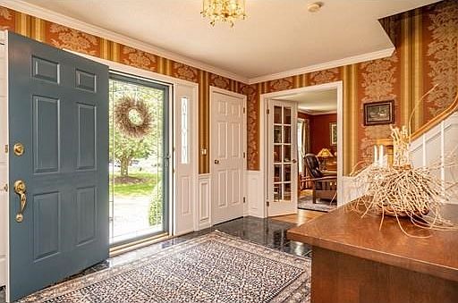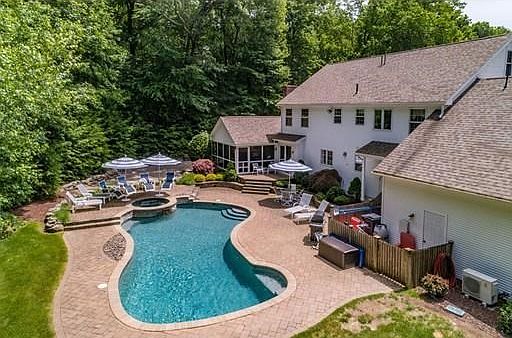 Elegant 9 room Colonial at the very end of cul de sac offers over an acre of private park like grounds. One owner, meticulously cared for custom home with stunning foyer, beautiful tile floors, wainscotting, and French doors opening to both living and dining rooms Kitchen has cherry cabinets, granite counters, large island and hardwood floors opening to bright, spacious family room with stone Fireplace, Built-ins, Skylights and Vaulted ceilings. Master Bedroom w walk in closet, Master Bath w double vanity and spa tub. Bedrooms all good size. Room over garage (aprx. 450 sq. feet) offers full bath, heat and AC, making it perfect bedroom, guest, office or studio space. Finished room in basement is great play or hobby room. Mechanics have been continually updated as has pool. Screened porch, multilevel patio, gunite pool (self cleaning and heated) with spa and waterfall feature all make this your own summer oasis. Back yard fenced w shed for pool storage. Shows beautifully!