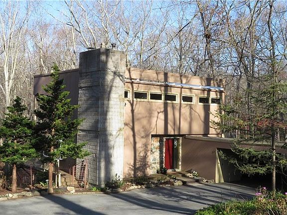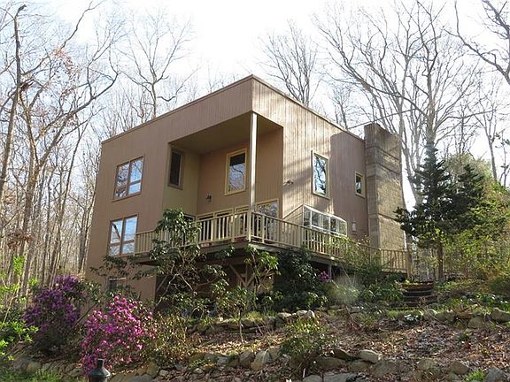 Looking for a ONE OF A KIND property? This is it! Unique and dramatic, sun filled 3BR/2.5BA Contemporary with an open and versatile floor plan! LR with cathedral ceiling and soaring walls of glass opens to the Sitting Room with brick fireplace with wood stove insert. Formal DR with slider leads to partially covered deck. Eat-in KT with walk-in pantry and screened back porch leads to fenced yard. THREE levels of living with finished LL with large FR with slider to patio and 2 additional rooms and bath. Use 3 bdrms on 2nd floor or 2 bdrms on LL. This stunning property is located on a cul-de-sac in a neighborhood setting, but has total privacy on 1+acre with beautiful grounds including LL patio and fire pit. This property also borders 5 acres of open space! Plus, a 2 car carport with 2 storage rooms. Come take a look at this truly outstanding home!