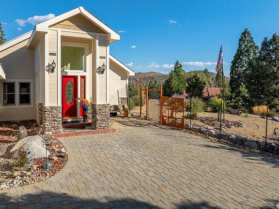As you approach this exceptional mountain retreat via the meticulously crafted all-paver driveway, you'll be welcomed by a property rich in natural beauty, featuring over 100 trees and an equally abundant array of plants, including a charming wild blackberry bush at the entrance., This residence combines the serenity of nature with modern conveniences, offering a tankless water heater and a 30-amp RV hookup. Outdoor enthusiasts will appreciate its prime location just 1/2 mile from hiking and biking trails that lead to Hobart Reservoir, Marlette Lake, and the scenic pathways of Lake Tahoe. The home provides stunning vistas, with breathtaking sunrises and sunsets visible from the side deck, while two illuminated waterfalls add a touch of elegance to the landscape. The property offers a variety of outdoor spaces, including a large, level area perfect for activities like soccer or horseshoes, accessible by two stone stairways. A cement slab provides a versatile space for basketball or other recreational pursuits, and the long, impressive paver driveway further enhances the curb appeal. Inside, the home is designed for comfort year-round with two air conditioning units, two heaters, and two gas fireplaces. The fenced backyard ensures pets are safe, and an electronic dog door provides ease of access for your furry companions. Parking for an RV is available on-site, and the property features a picturesque aspen grove with approximately 30 trees. With abundant wildlife in the surrounding area and located within a well-established, friendly community, this property offers a rare blend of seclusion and convenience, making it an ideal sanctuary for those seeking a refined, nature-inspired lifestyle.
