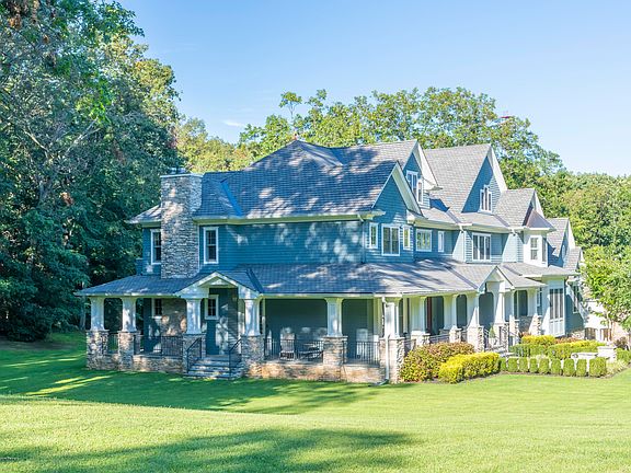 Stunning custom built, cedar-shake and stone home nestled in an almost 2 acre park-like setting. Inviting wrap around porch leads to a beautiful entrance. Two story great room floor to ceiling windows, custom wooden cabinetry and a gas fireplace. Chef's kitchen displays detailed molding and cabinets, two dishwashers, Thermador 6 burner stove and double ovens, and full sized Thermador freezer and refrigerator. Butler's pantry has wine fridge and sink. First floor master is two story complete with ensuite and custom walk in closet. Second floor master has a fireplace, balcony, ensuite and custom walk in closet. All bedrooms are generous in size and have ensuites as well. This home has a whole house generator, electric dog fence, paver driveway, 3 car garage, poured concrete foundation, huge