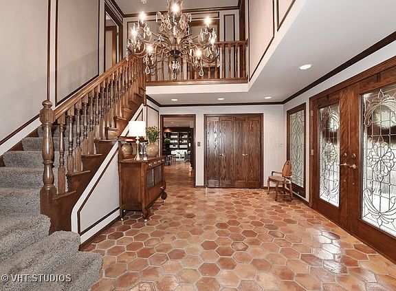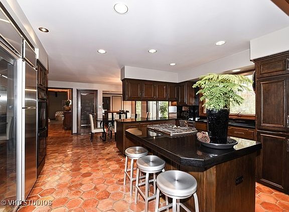 Best value for Elm Elem School. Priced well under appraisal. Dressler built California style estate home with forest preserve like view in back overlooking a creek. Acclaimed Hinsdale Elm School. Almost 1 acre lot. Granite counters in kitchen. 2 refrigerators and two dishwashwashers. Cathedral or 2 story ceilings in the foyer, master bedroom, loft, and 2nd floor BRS. Handmade Spanish tiles most of 1st fl. Hardwood plank floors 2nd fl, and Master BR. Patio off Master BR suite. 2nd BR guest suite with a private balcony and full bath. 3 level flagstone patios & stone retaining walls.Lush landscaping, in-ground salt water pool & hot tub. Paver brick circular drive. Recently renovated basement in 2014 including a rec room with custom cabinets, full bath with a steam shower, Porcelain tiles, 5th bedroom suite private bath with a steam shower, built-in cabinets, marble counters, sink and refrigerator. Walk to Katherine Legge Park noted for picnic groves, walking paths, playgrounds, etc.