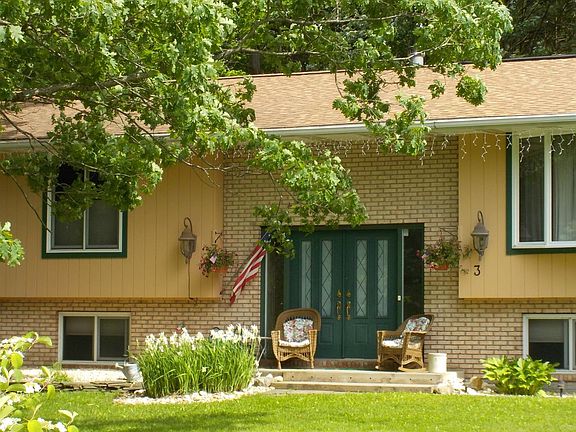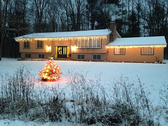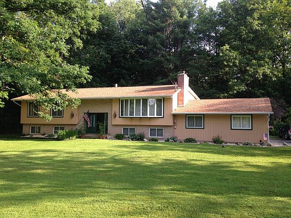 Dramatic 1970's contemporary home in move-in condition on 1.3 well-landscaped acres in the Ellis Highlands subdivision. With its grand entry, generous all season sun-room with skylights and cathedral ceilings, updated kitchen and 2.5 baths, you'll immediately feel at home. Four bedrooms, two fireplaces, central AC, and custom blinds. Tons of bonus space (another 1200 square feet!) on the lower level, now being used for hobbies and home office. Excellent mechanicals, private well and septic, and cable through Spectrum.