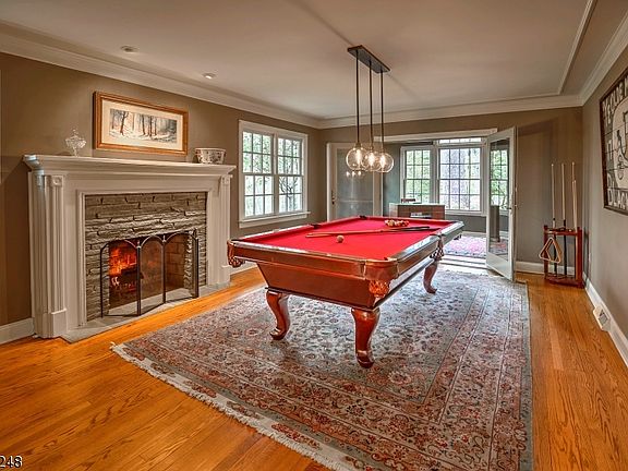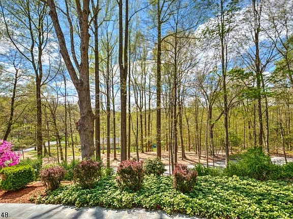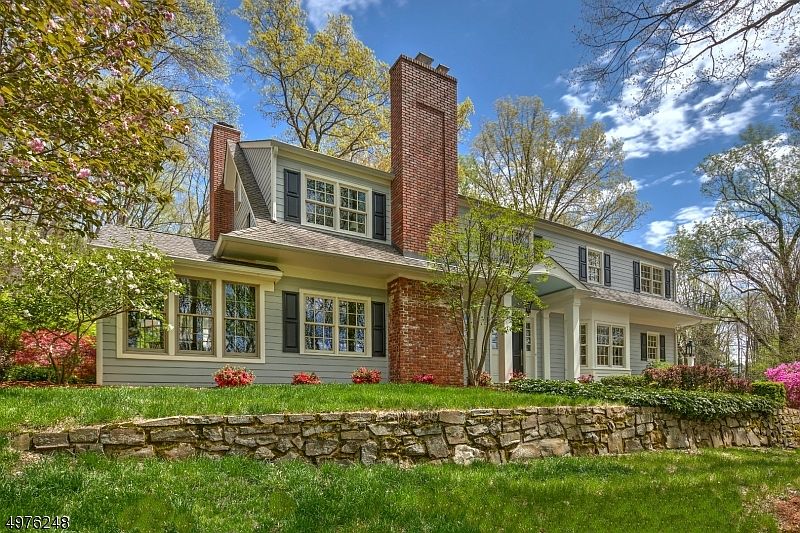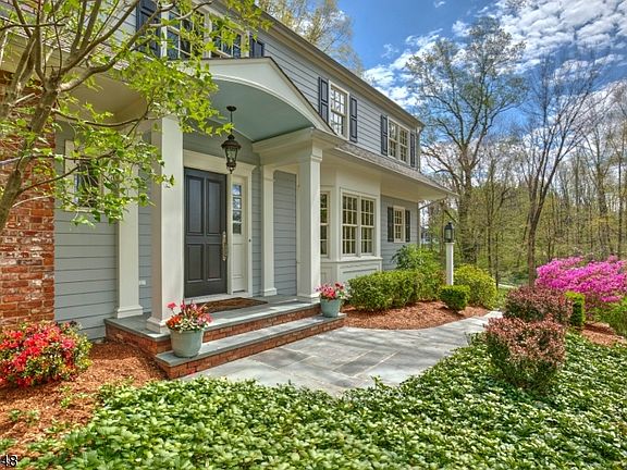 A stunning custom Colonial featuring a Hardie plank exterior in classic Coventry Gray was designed and crafted with great attention to detail by the renowned local architectural firm Mendham Design Group and constructed in 2003. Featuring hardwood floors and crown moldings throughout, this four bedroom home exudes craftsmanship, style and outstanding levels of interior and exterior maintenance. Perched above Mendham's charming and desirable Brookside section in a parklike setting, the property in the east side of Mendham Township takes in majestic western views with close proximity to Patriots Path and Mendham Township Schools. Introduced by an elegant two-story foyer with Travertine marble floors, the impressive entrance opens to a formal dining room with elegant French pocket doors and bay window, perfect for both special occasions and intimate dinner parties. Across the foyer is a stylish living room with a wood-burning fireplace, crown base and ceiling moldings and beautiful leaded glass window. Privately situated behind French doors is the light-filled office or library with a vaulted ceiling and built-in bookshelves, perfect as a home office space. The generously-sized kitchen opens to the family room, making it a true heart-of-the-home gathering area. The kitchen presents granite countertops, maple wood cabinetry, a center island offering breakfast bar seating and a separate dining area. Just steps away are a large walk-in pantry, marble floored powder room and laundry area. The comfortable family room is anchored by a stone wood-burning fireplace and French doors to a covered porch and bluestone patio. The charming covered porch has a wainscoted ceiling, built-in speakers and lighting; it opens to a lovely bluestone patio with built-in seating and grill surrounded by stacked slate stone. Continuing the exceptional hardscaping is a stone fire pit area that is ideal for enjoying the outdoors all year long. The second floor master suite is generous in size with a tray ceiling, expansive walk-in closet and spa bath with stall shower, jetted tub and double sink vanity. Down the hall are three more spacious bedrooms with double closets and a roomy full bath with double sink vanity and shower/tub combination. A cozy bonus room with French glass doors rounds out the second floor, an ideal space for a playroom or second office. The finished walkout lower level includes a recreation area, full bath, oversized built-in storage cubbies, and access to the gym area and two-car garage offering additional storage. Mendham Township in Morris County is located about 40 miles west of New York City with Midtown Direct Train service available in neighboring Morristown or Bernardsville. Students attend highly-ranked schools including West Morris Mendham High School, which New Jersey Monthly magazine rated as the #7 high school in the state. The Brookside section of Mendham is home to the excellent elementary school and Blue Ribbon-designated Middle School as well as the local library, municipal offices, Brookside Community Club and Fire Engine Company #1.