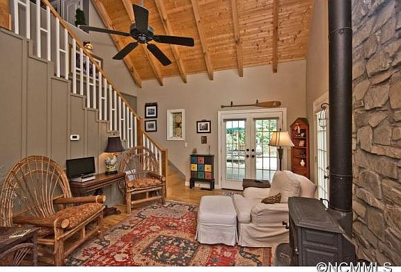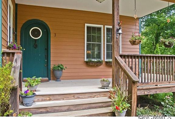 Fantastic Mt. Living! 2BR/2BA. Hickory flooring + ceramic tile. Granite tops, SS appl. Antique arch top door, Lge. wrap around deck overlooking bold Sandy Mush Crk. Jotul wood stove, central H/A. Gently arched int. beams, crown molding, antique like vanities, tumbled marble tub surrounds. Open beam cath. ceilings, Hardiplank siding. 2nd BR in loft w/full bath.