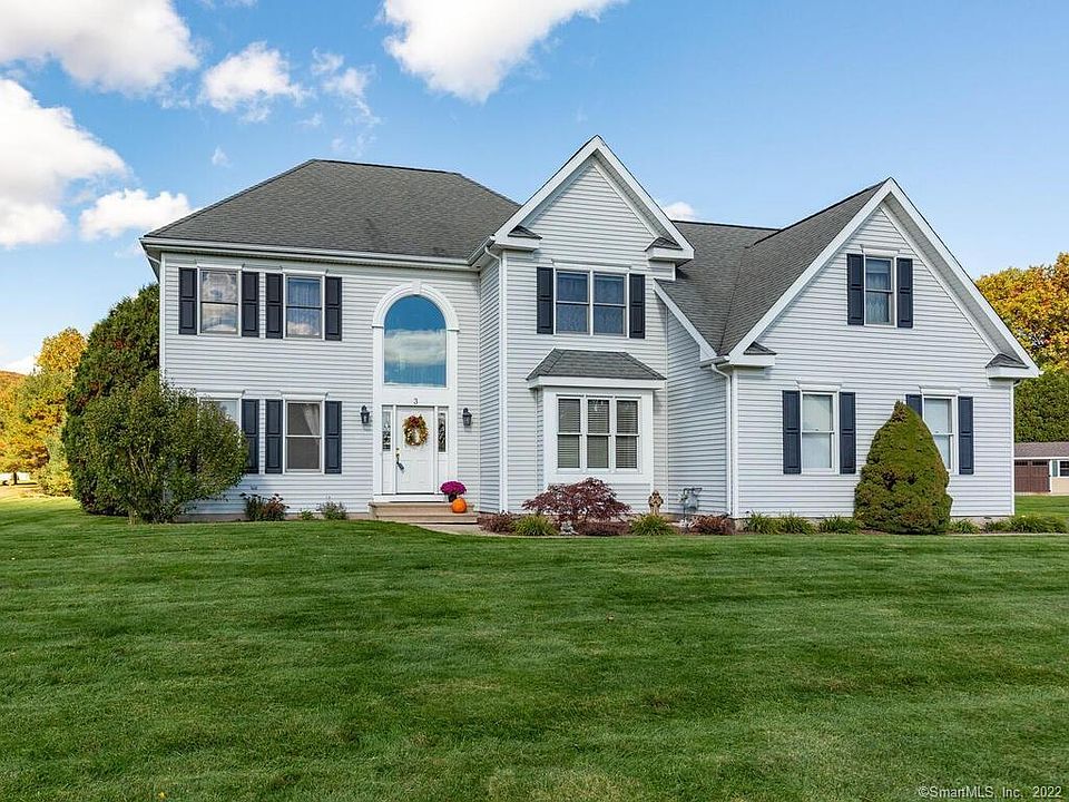 Welcome home to 3 Yorktown Road! This young colonial is situated near the base of Southington Mountain and offers beautiful views throughout the seasons. Located on a corner lot in a quiet neighborhood, you will love spending time outside in the beautiful yard and inside in the spacious and welcoming open floor-plan. Downstairs you are greeted by a two story foyer with a grand staircase that flows into a large eat-in kitchen with a chef's range. This opens to the family room with a gas fireplace and secondary staircase to the second level. The main-floor also offers a private office (which could easily be a 5th bedroom), formal living and dining rooms. Upstairs is the primary suite with Jacuzzi bath as well as two additional large bedrooms plus a bonus room perfectly situated for an additional bedroom or rec space. There is no shortage of closet space throughout the home. The basement is partially finished and is perfect for your home gym or whatever else you can imagine. Lots of luxuries including 9ft+ ceilings, hardwood floors, central air and more. Desirable school district. Showings start 10/22 but can be scheduled immediately. Town card lists 3 bedrooms, septic is designed for 5 bedrooms. Seller prefers flexible closing but has secured housing.